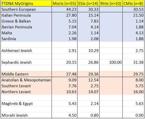 - Moroccan Jews are on average more “European” than ESJs and CMJs, most evident in their Southern Italy and Iberian Peninsula scores.