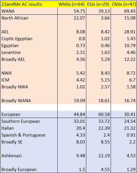 23andMe results are unique in part because the components are structured differently; here, most components fit into an upper or broader category. For example, one of these categories is abbreviated as “WANA”, meaning Western Asian & North African, and it includes a North African component, broad components like “Arabian, Egyptian, and Levantine” and “Northwest Asian” which themselves include sub-components, and even a Broadly WANA component which always includes a substantial portion of these Jews’ total WANA ancestry. This system makes sense as it acknowledges that all components are related to each other and some are more related than others. But it requires a slightly different interpretation, relative to the other companies considered here.