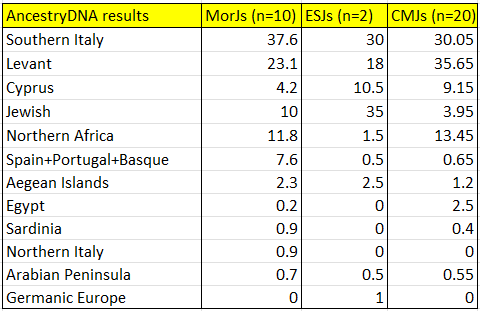 - The Cyprus component is lower on average in Moroccan Jews than in ESJs and CMJs, but those scores are highly variable and it may not be that informative.