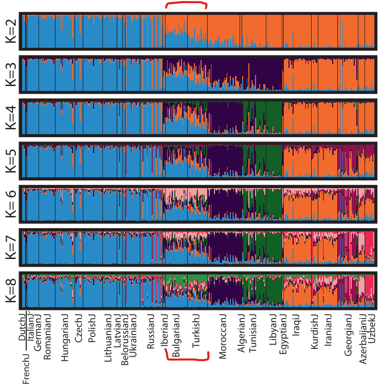 First, I want to share a graphic from the population genetics study Kopelman et al. 2018, which formally replicates our findings. This analysis by the program STRUCTURE assumes the existence of “clusters” that can correspond to ancestry differences within the dataset under analysis. “K” here corresponds to the number of clusters in each run, and the populations under review represent most of the distinct Jewish communities today. The blue cluster corresponds to Ashkenazi ancestry, as we see it peaking in virtually all Ashkenazi Jews.